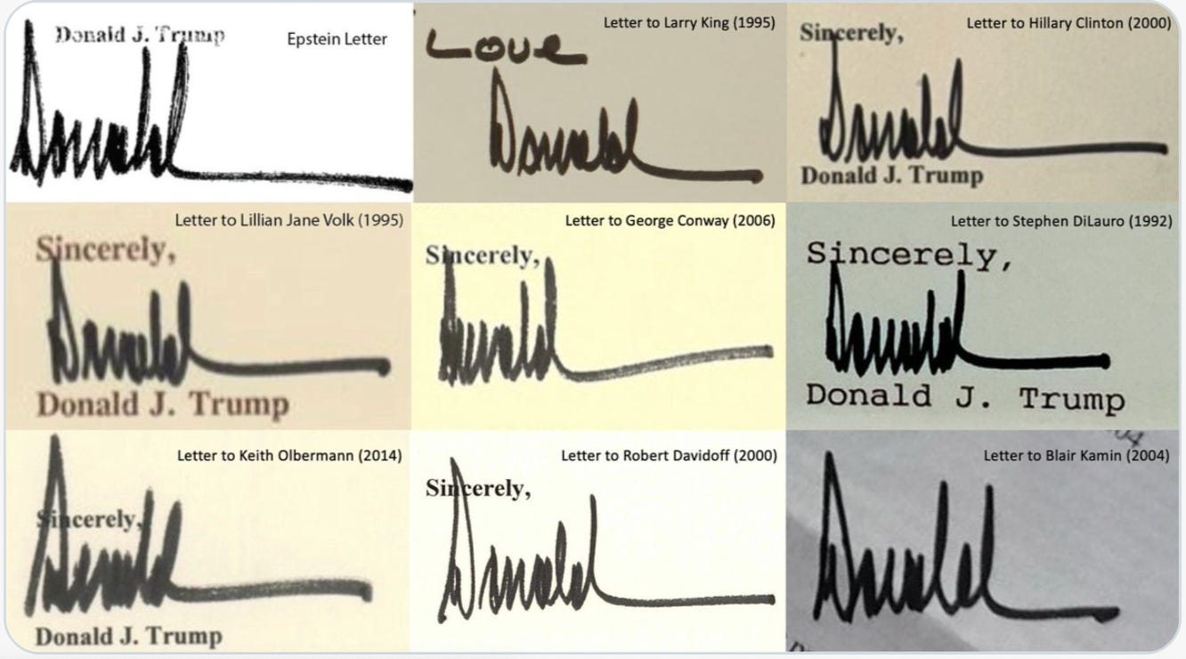 The disputed signature in the Epstein “birthday book” is simply “Donald” with a long horizontal line.