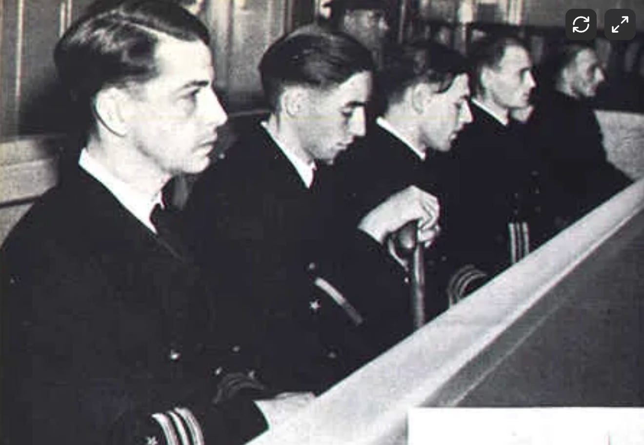 In October 1945, a British Military Court convened at Hamburg (Curiohaus) to try Heinz-Wilhelm Eck and four of his crew members: August Hoffmann (2nd watch officer), Walter Weispfennig (boat’s doctor), Hans Lenz (chief engineer), and Wolfgang Schwender (engine-room rating).